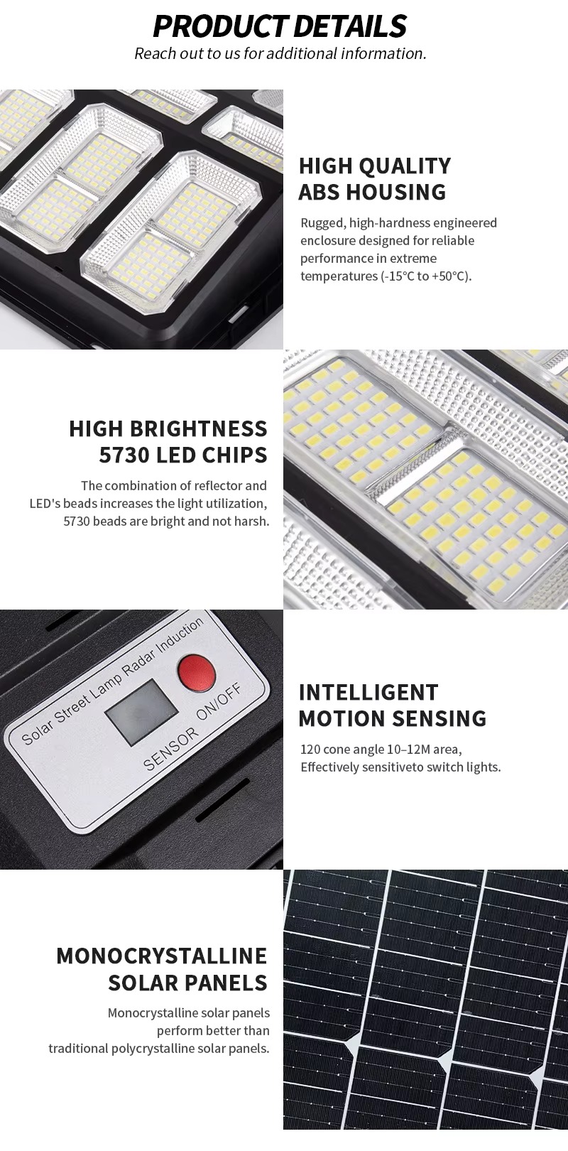 • Controlador inteligente: Protección contra sobrecarga/sobredescarga, control de luz + temporizador + sensor de movimiento, optimizando la energía según la intensidad lumínica ambiental.